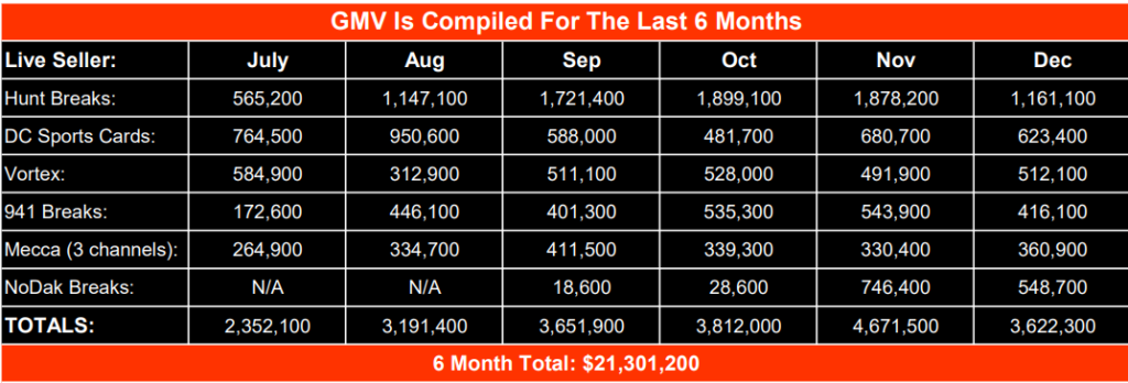 SNL Enterprises Has 6 Live Sellers Under Contract For 5 Years, With Many More Contracts Currently Pending In Legal. Currently Under Contract Are Hunt Breaks, Nodak Breaks, DC Sports Cards, Vortex, 941 Breaks, Mecca Of Sports Cards X3 Channels.